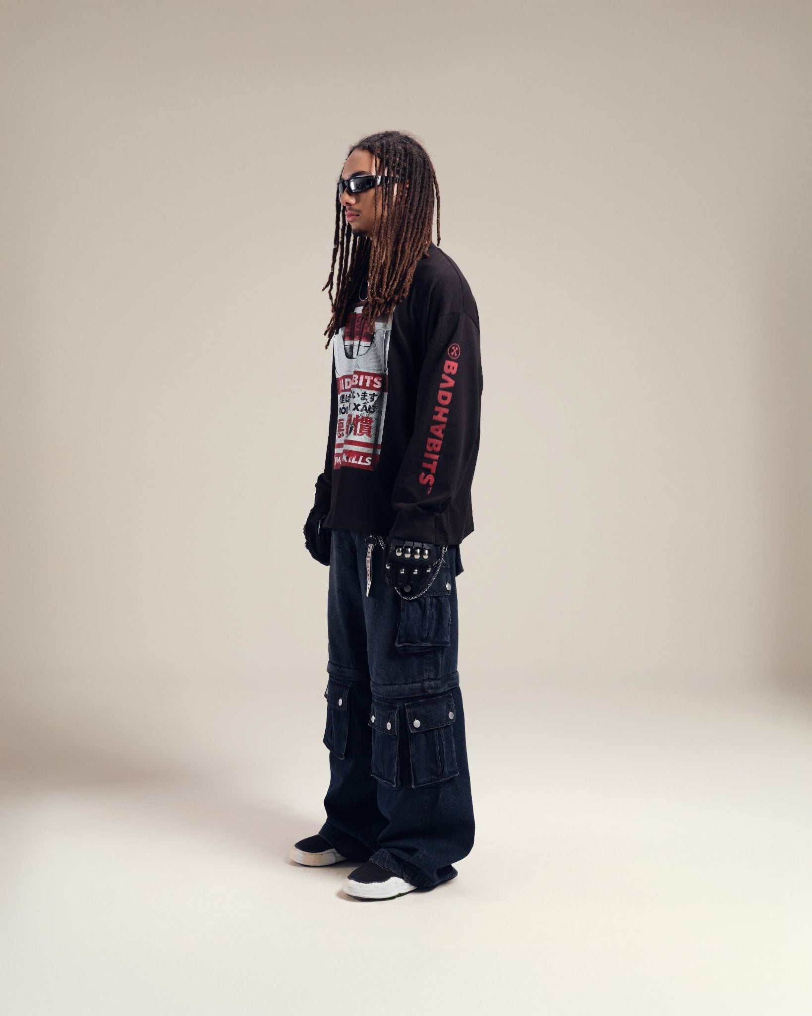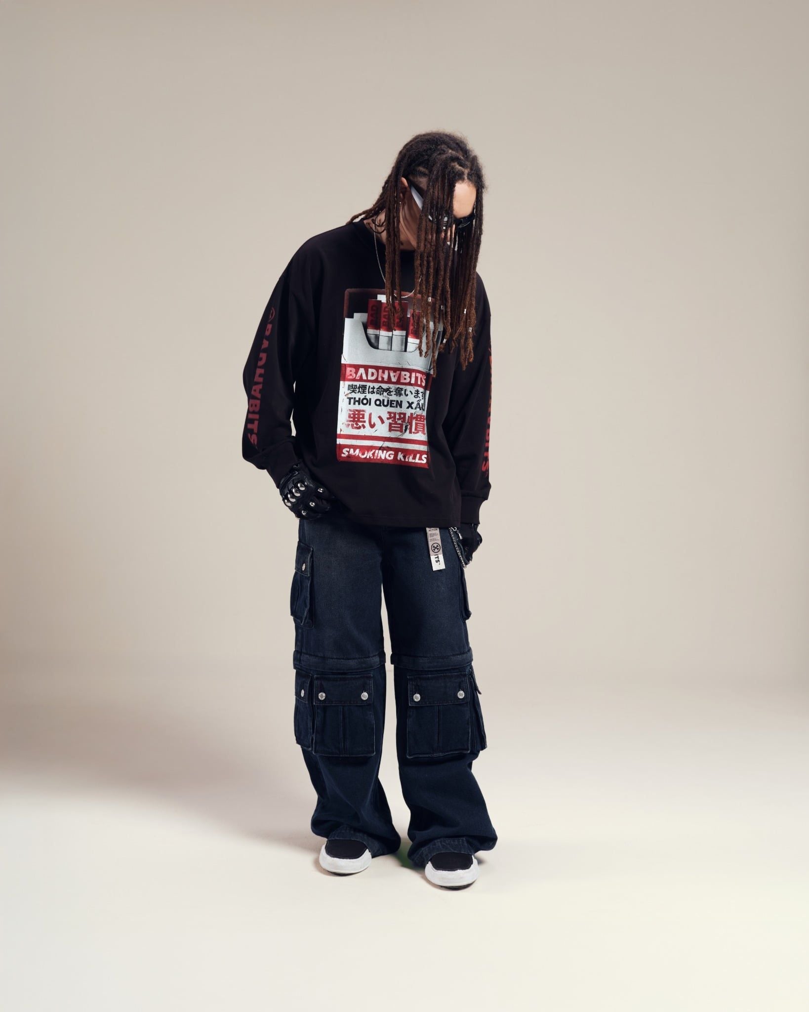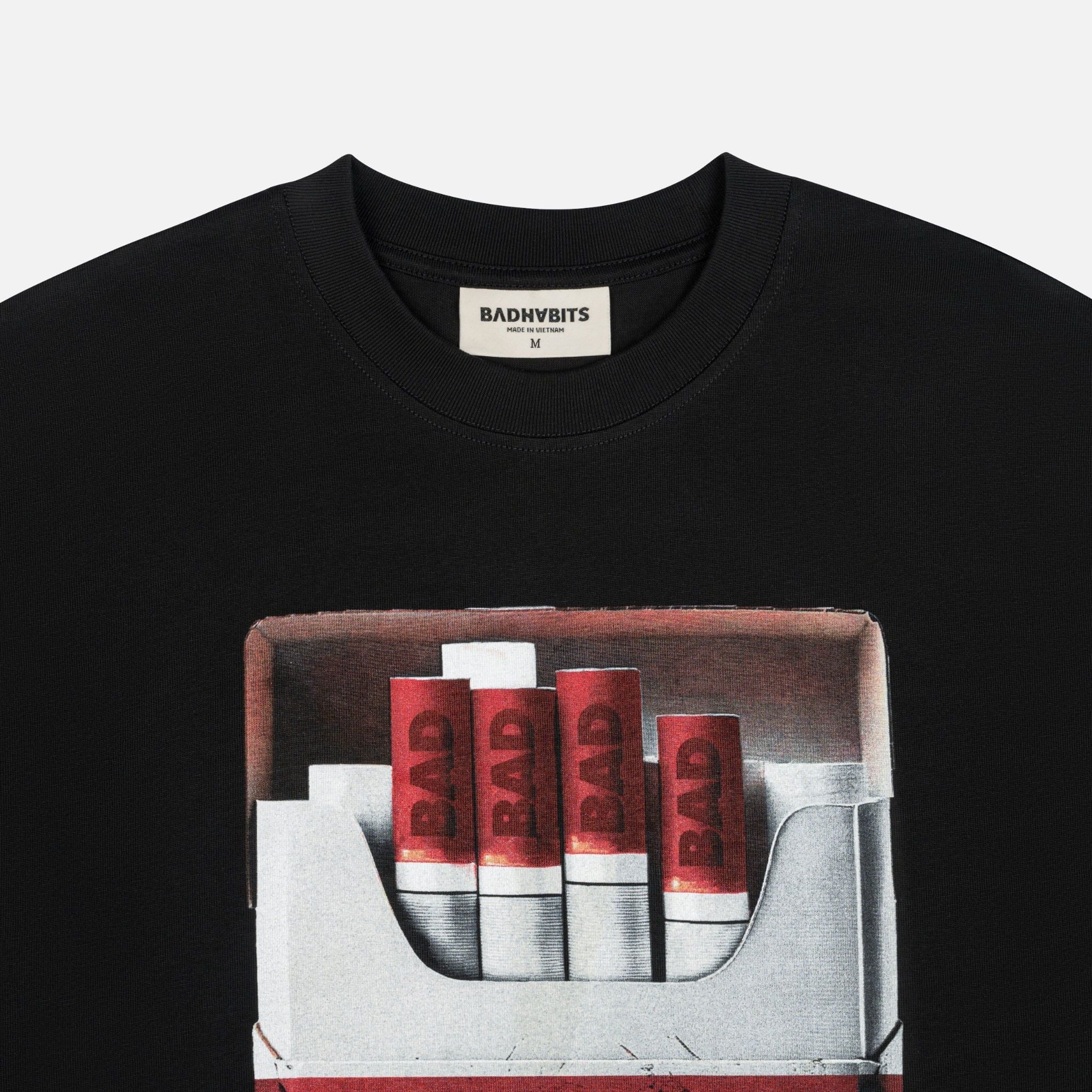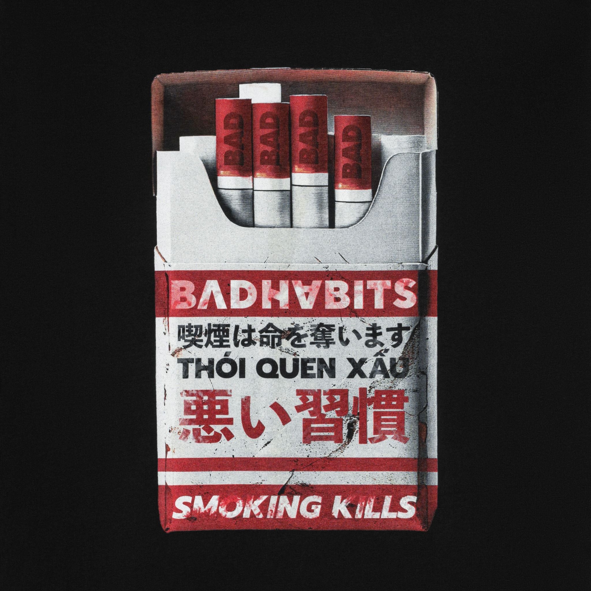 Họa tiết in trame độc đáo, nổi bật với hình bao thuốc lá cùng thông điệp mạnh mẽ "BAD HABITS" và "SMOKING KILLS".