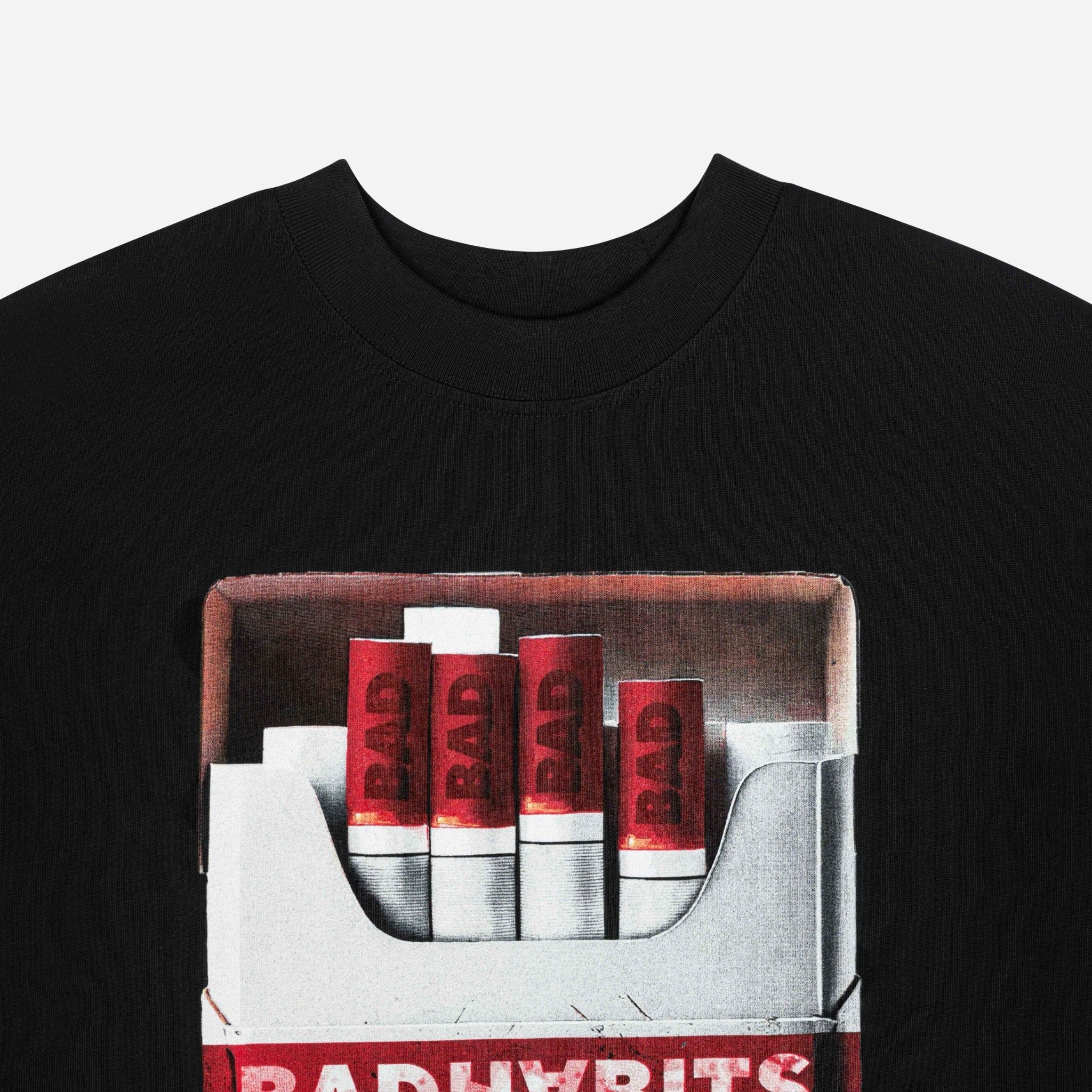 Họa tiết in trame độc đáo, nổi bật với hình bao thuốc lá cùng thông điệp mạnh mẽ "BAD HABITS" và "SMOKING KILLS".